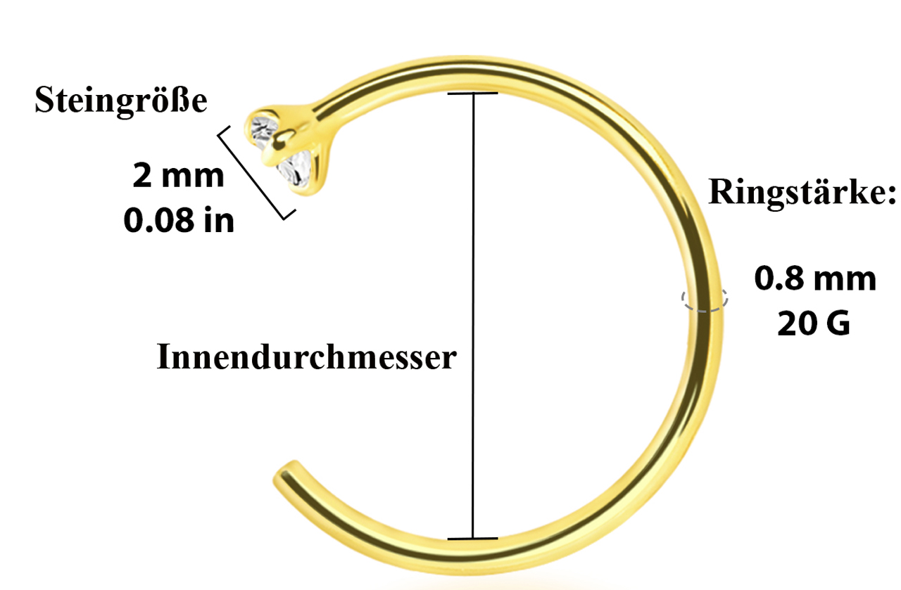 Die genauen Abmessungen dieses Hoop Rings sind entscheidend für seinen optimalen Sitz und Tragekomfort. Die Ringstärke beträgt feine 0,8 mm, was ihn zu einem zarten und unaufdringlichen Schmuckstück macht, das sich gut in das Piercing einfügt. Diese Dicke ist typisch für viele Erst- und Folgeschmuckstücke und sorgt für eine angenehme Passform. Der Innendurchmesser des Rings misst 8 mm. Diese Größe ist sorgfältig gewählt, um eine breite Kompatibilität für verschiedene Piercing-Platzierungen zu gewährleisten und gleichzeitig genügend Spielraum für eine bequeme Handhabung zu bieten. Die Kombination aus geringer Ringstärke und idealem Innendurchmesser stellt sicher, dass der Ring weder zu eng noch zu locker sitzt, sondern sich harmonisch an die Anatomie anpasst.
